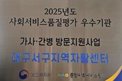 정안뉴스 안정주 기자 | 대구 서구지역자활센터는 보건복지부 주관 2025년 가사·간병 방문지원사업 품질 평가에서 전국 349개소 중 상위 9개소에 해당하는‘우수 기관’으로 선정됐다. 이번 평가는 ▲기관 운영 ▲제공 인력 및 인적자원관리 ▲서비스 제공 및 평가 ▲서비스 성과 ▲현장 평가단 등 5개 영역에서 실시됐으며, 서구지역자활센터는 전 영역에서 90점 이상의 높은 점수를 획득하며 탁월한 운영 역량을 입증했다. 우수 기관으로 선정된 서구지역자활센터는 포상금과 함께 보건복지부 장관 상장, 우수 기관 현판을 수여받는 영예를 안았다. 이는 지역사회 내 돌봄서비스의 질적 향상과 지속 가능한 가사간병방문지원사업 운영에 큰 동력을 제공할 것으로 기대된다. 류한국 서구청장은 “앞으로도 가사·간병 방문 지원 서비스 대상자에게 질 높은 서비스를 제공하고, 제공 인력인 요양보호사들에게 건강하고 내실 있는 일자리를 제공할 수 있도록 서구지역자활센터를 지속적으로 지원하겠다.”라고 밝혔다.