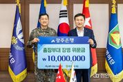 정안뉴스 안정주 기자 | 광주은행은 26일, 77주년 국군의 날을 앞두고 지역방위 책임사단인 제31보병사단(사단장 이일용)을 방문해 위문금 1천만원을 전달하고 장병들을 격려했다고 밝혔다. 이날 전달식에는 고병일 광주은행장, 이일용 제31보병사단 사단장 및 관계자가 참석한 가운데, 지역 안보의 최일선에서 헌신하는 장병들의 노고에 감사를 전하는 뜻깊은 시간을 가졌으며, 전달된 위문금은 장병들의 복지 증진과 사기 진작을 위해 사용될 예정이다. 고병일 광주은행장은 “지역민들이 안심하고 일상을 누릴 수 있는 것은 국토방위를 위해 헌신하는 장병 여러분 덕분이다”라며, “광주은행은 지역 대표은행으로서 ESG경영을 기반으로 다양한 사회공헌 활동을 지속적으로 확대해 나가겠다”고 말했다. 한편, 광주은행은 매년 제31보병사단을 방문해 위문활동을 이어오고 있으며, 군 장병 적금 및 전용 제휴카드 출시 등 맞춤형 금융서비스 제공에도 앞장서고 있다.