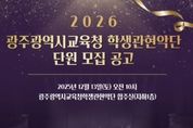 정안뉴스 안정주 기자 | 광주시교육청학생교육문화회관은 ‘2026 광주광역시교육청 학생관현악단’ 신규 단원을 모집한다. 시교육청 학생관현악단은 학생들의 음악적 기량과 감수성을 키우기 위해 운영되고 있다. 매주 토요일 합주연습과 연주회, 기획공연 참여 등 다양한 음악 활동을 펼친다. 모집 대상은 광주지역 초등학교 3학년~고등학교 2학년 학생, 같은 연령대 학교 밖 청소년 등이다. 관현악 합주 연주 능력이 있고 음악활동에 관심이 있는 학생, 청소년이라면 오는 3~10일 학교장 추천 서류를 접수하거나 개별 방문 접수하면 된다. 분야는 바이올린, 비올라, 첼로, 콘트라베이스, 플루트, 오보에, 클라리넷, 바순, 호른, 트럼펫, 트럼본, 튜바, 타악기 등이다. 공개 오디션은 오는 13일 오전 10시 학생교육문화회관 지하 1층 학생관현악단 합주실에서 진행된다. 지원자는 자유곡 1곡을 준비해야 하며, 악보를 보고 연주할 수 있다. 단, 반주자는 동반할 수 없으며, 개인 악기를 지참해야 한다.(콘트라베이스, 타악기 제외) 단원 모집 관련 내용은 학생교육