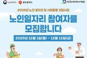 정안뉴스 안정주 기자 | 광주광역시는 노인공익활동사업, 노인역량활용사업 등 ‘2026년 노인일자리 사업’ 참여자를 12월 1일부터 12일까지 모집한다. 광주시는 2026년 노인일자리사업에 1574억원의 예산을 투입해 3만6440명의 어르신에게 일자리를 제공하며, 5개 자치구와 5개 시니어클럽 등 72개 일자리 수행기관에서 다양한 사업을 추진한다. 모집인원은 사업유형별로 ▲노노케어 등 노인공익활동사업 2만6479명 ▲보육시설보조 등 노인역량활용사업 6038명 ▲매장운영 등 공동체사업단 2754명 ▲민간업체 취업지원(취업알선형) 사업 1169명이다. 모집대상은 광주시 거주 어르신으로, 노인공익활동사업은 65세 이상(일부 60세 이상) 기초연금수급자 등 기준을 충족한 어르신이다. 노인역량활용사업은 65세 이상(일부 60세 이상), 공동체사업단·취업지원(취업알선형)은 60세 이상 어르신이 신청할 수 있다. 단, 국민기초생활보장법의 생계급여 수급자, 국민건강보험 직장가입자, 장기요양보험 등급판정자(1~5등급), 다른 부처 일자리 사업 참여자 등은 모집 대상에서 제외된다. 신청은 신분증·주민등록등