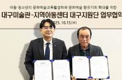 정안뉴스 안정주 기자 | 대구문화예술진흥원 대구미술관과 지역아동센터대구지원단(단장 이상열)은 지난 10월 15일 대구미술관에서 아동·청소년 문화예술교육 활성화와 문화예술 향유 기회 확대를 위한 업무협약을 체결했다. 이번 협약식에는 노중기 대구미술관장과 이상열 지역아동센터대구지원단장을 비롯해 양 기관 관계자들이 참석했으며, 지역 아동·청소년이 예술을 통해 성장할 수 있는 지속 가능한 협력체계 구축을 약속했다. 협약에 따라 양 기관은 ▲대구미술관 전시 및 교육 프로그램에 ‘지역아동센터’와 ‘대구형 방과 후 틈새돌봄사업’ 아동·청소년의 참여 지원 및 독려 ▲아동·청소년 대상 맞춤형 문화예술교육 프로그램 공동 기획 및 운영 ▲프로그램 참여 효과 제고를 위한 자료 공유 및 교육 정보 교류 ▲기타 상호 발전을 위한 교육 관련 협력 등 다양한 분야에서 상호 협력하기로 했다. 특히 이번 협약을 계기로 지역아동센터 종사자 교사를 대상으로 한 전문교육 워크숍을 오는 10월 21일 대구미술관에서 진행한다. 프로그램은 열린 교육 ‘샤이닝 트레일즈’와 연계하여 현대미술의 새로운 접근 방식을 모색하고, 자연·빛·인간을