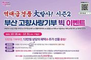 정안뉴스 황정혜 기자 | 부산시는 오늘(16일)부터 12월 31일까지 77일간, 고향사랑기부제 참여 확산을 위해 '역대급 경품 대발사 시즌2! 부산 고향사랑기부제 연말 빅 이벤트'를 개최한다고 밝혔다. 지난 5월 진행된 ‘역대급 경품 대발사’ 이벤트는 해운대 5성급 호텔 숙박권을 포함한 푸짐한 경품으로 많은 시민들의 뜨거운 관심과 참여 속에 성황리에 마무리됐다. 이번 시즌2 이벤트는 그 성원에 힘입어 더욱 풍성한 혜택과 경품으로 시민들을 다시 한번 찾아온다. 특히, 올해 10월 17일부터 부산에서 개최되는 제106회 전국체육대회와 연계해 이번 이벤트를 가을부터 연말까지 이어가며, 시민들에게 다채로운 혜택과 즐거움을 제공할 계획이다. 이와 함께 시는 전국체전 기간(10.17.~10.23.)과 전국장애인체전 기간(10.31.~11.5.)에 ‘고향사랑기부제 홍보 공간(부스)’을 운영해 현장 방문객들에게 기부제 취지와 참여 방법을 적극 알릴 예정이다. 또한 이벤트 기간 중 시청에 1회 10만 원 이상 기부한 기부자에게 기본혜택 2가지와 함께 특별한 추가 경품 4가지를 증정한다. [