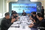 정안뉴스 안정주 기자 | 부안군은 20일 군청 3층 중회의실에서 정화영 부군수 주재로 2026년 부군수-읍·면장 회의를 개최하고 2025년 주요 성과와 2026년 군정 운영방향을 공유하며 읍·면 현안에 대한 사전 점검에 나섰다고 밝혔다. 이번 회의는 오는 26일부터 추진 예정인 2026년 군민과의 희망소통대화를 보다 내실 있게 운영할 수 있도록 사전 준비 차원에서 마련됐다. 회의에서는 부안의 미래 비전과 주요 성과, 부안형 바람연금 추진 현황을 비롯해 각 읍·면별 주요 현안과 건의사항을 공유하며 지역 여건을 종합적으로 점검했다. 특히 정화영 부군수는 읍·면장들과의 심도 있는 논의를 통해 현장 중심 행정의 중요성을 강조하며 군민과의 희망소통대화 과정에서 주민 의견이 실질적인 군정에 반영될 수 있도록 적극적인 역할을 당부했다. 정화영 부군수는 “군민과의 희망소통대화는 단순한 연초 방문이 아니라 지난 성과를 공유하고 앞으로의 군정을 함께 설계하는 소중한 자리”라며 “읍·면장들과 충분한 사전 소통을 통해 군정에 대한 공감대를 높이고 군민이 체감할 수 있는 행정을 펼쳐 나가겠다”고 말했다. 한편