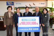 정안뉴스 김재홍 기자 | 창녕군 출신의‘기부 천사’(주)리베라관광개발 김태명 회장이 올해도 변함없이 어려운 장애인을 위해 써달라며 5일 성낙인 창녕군수를 찾아 1억 원을 기탁했다. 창녕군은 김태명 회장이 (사)경남지체장애인협회 창녕군지회(김희정 회장)에 지속적인 관심과 꾸준한 기부를 이어오고 있다고 밝혔다. 김태명 회장은 25년 넘게 도내 장애인과 독거노인, 취약계층을 직접 찾아가며 꾸준한 나눔 활동을 이어왔다. 도내 18개 시·군을 돌며 경로 위안 행사, 장학금 전달, 사랑의 쌀·난방유 후원 등 맞춤형 사회공헌 활동을 지속하며 지금까지 25년간 60억 원이 넘는 금액을 지역사회에 기부한 것으로 알려졌다. 이러한 공로를 인정받아 올해 3월 제59회 납세자의 날에는 대한민국 정부로부터 산업포장을 수훈하며 성실한 납세와 사회공헌 기여로 모범 기업인의 면모를 보였다. 또한 제42회 경남도민의 날을 맞아 제1회 자랑스러운 경남인상(사회공헌 부문)을 수상하는 등 지역 사회 발전에 기여한 공로를 널리 인정받고 있다. 성낙인 창녕군수는“장애인을 향한 지속적인 관심과 따뜻한 나눔에 깊은 감동을 받았다