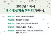 정안뉴스 김재홍 기자 | 거제시가 지역사회 학습공동체 형성과 배움문화를 조성하기 위해 '2026년 거제시 우수 평생학습 동아리 지원사업'을 실시한다. 지원대상은 관내 소재 평생학습동아리이며, 선정된 학습동아리 5개팀에 강사비, 교재·재료비, 홍보비 등 동아리 활동에 필요한 직접 운영 경비(100만원)를 지원한다. 신청방법은 공모신청서를 작성하여 거제시 평생교육과로 방문접수하면 되고, 접수기간은 4월 22일부터 4월 24일까지이다. 기타 자세한 사항은 거제시 평생학습관 홈페이지 공지사항 또는 거제시 평생교육과 평생학습팀으로 문의하면 된다. [뉴스출처 : 경상남도거제시]