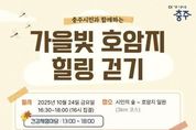 정안뉴스 황은경 기자 | 충주시는 걷기 좋은 가을을 맞아 오는 24일 시민의 숲과 호암지 일대에서 ‘가을빛 호암지 힐링 걷기’를 개최한다고 밝혔다. 이번 행사는 깊어가는 가을의 정취 속에서 시민들이 함께 걸으며 건강한 생활습관을 실천하고, 다양한 건강체험 프로그램을 통해 스스로 건강 상태를 확인할 수 있도록 마련됐다. 걷기 행사는 오후 4시 함지길(충주종합운동장 보조경기장 인근)에서 집결해 간단한 스트레칭 후 호암지 일부 구간을 걷고 오는 약 3km 코스로 진행된다. 코스 중간에는 체크포인트 이벤트와 버스킹 공연이 함께 마련돼 재미와 활력을 더하며 누구나 부담 없이 참여할 수 있는 프로그램으로 구성됐다. 본행사에 앞서 오후 1시부터는 ‘건강체험부스’가 운영된다. 이곳에서는 △혈압·혈당·체성분 검사 등 기본 건강 측정 △금연·절주·구강건강 등 건강생활실천 홍보 △치매 예방 캠페인 △풍선아트·양말목공예 등 다양한 참여형 프로그램이 마련돼 온 가족이 함께 즐길 수 있는 체험의 장이 될 전망이다. 특히 올해는‘보행측정장비’를 새롭게 도입해 참가자들의 보행 패턴과 균형 상태를 분석하