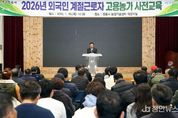 정안뉴스 안정주 기자 | 정읍시는 15일 농업기술센터에서 2026년도 법무부 배정 농가를 대상으로 외국인 계절근로자 프로그램 사전 교육을 진행했다. 이날 교육에는 지난 12월 말 법무부로부터 외국인 계절근로자 배정을 승인받은 농가주와 각 읍면동 담당 공무원 등 200여 명이 참석했다. 교육은 고용주를 대상으로 찾아가는 농업 노무 교육인 ‘노무랑 농부랑’ 프로그램을 비롯해 외국인 계절근로자 사업의 전반적인 취지와 올해 달라지는 주요 개정 사항을 안내하는 순서로 진행됐다. 특히 시는 고용주가 반드시 지켜야 할 근로시간 준수와 적정한 주거 환경 제공 등 인권 친화적인 고용 환경 조성을 강조했다. 또 무단이탈 발생 시 조치 사항 등 현장에서 발생할 수 있는 문제들에 대한 대응 매뉴얼도 공유했다. 시는 이번 교육을 통해 고용 농가의 제도 이해도를 높이고 현장의 건의 사항과 애로사항을 면밀히 청취해 정책에 반영할 계획이다. 이를 통해 안정적인 인력 운영을 돕고 고용주와 근로자가 서로 존중하는 선진적인 근로 문화를 정착시킨다는 방침이다. 이학수 시장은 “외국인 계절근로자 제