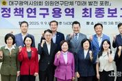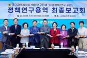정안뉴스 안정주 기자 | 대구시의회 의원연구단체 ‘대구미래혁신포럼’(대표 이재숙 의원)은 9월 9일, 시의회 3층 회의실에서 소속 의원들이 참석한 가운데 정책연구용역 최종 보고회를 개최했다. 이날 보고회에서는 김태우 의원(수성구5)이 제안한 '광역·기초자치단체 청년정책 연계 활성화 방안 연구'와 김재용 의원(북구3)이 제안한 '공공 파크골프장의 운영 효율화를 통한 활성화 방안 연구' 등 총 2건의 과제가 발표됐으며, 각 과제를 수행한 연구진, 대구미래혁신포럼 소속 시의원, 대구시 관계자 등이 참석했다. 첫 번째 연구 발표자인 대구정책연구원 박경숙 부연구위원은 지방자치단체 간 공동 이슈 발굴과 청년 참여 기반의 공동 기획·집행, 제도 정비와 협력 거버넌스 체계화를 위한 정책 방향을 제시했다. 특히 연구 수행 과정에서 기초의원, 청년정책 담당 공무원, 청년센터장을 대상으로 세미나 및 간담회를 개최해 현장의 애로사항과 협업 아이디어를 폭넓게 수렴했고, 그 의견을 최종 보고서에 반영했다. 청년정책 연구를 제안한 김태우 의원은 “지역 청년정책의 실효성을 높이기 위해서는 청년 수요에 기반한 광역자치단체와 기초