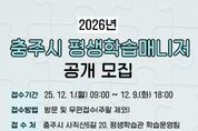 정안뉴스 황은경 기자 | 충주시가 주민의 근거리 학습권 보장과 지역 특성에 맞는 평생학습 실현을 위해 ‘2026년 충주시 평생학습매니저’를 공개 모집한다고 28일 밝혔다. 이번 모집은 읍면동 평생학습센터를 중심으로 지역 곳곳의 학습 현장을 지원하고 시민 참여형 평생교육 기반을 강화하고자 마련됐다. 지원 자격은 충주시 주민등록자로서, 충주시에서 운영한 △충주시 평생학습매니저 양성과정 △읍면동 평생학습매니저 양성과정 △행복학습매니저 양성과정 △2025 평생학습매니저 양성과정(건국대 RISE 협업) 중 1개 이상을 수료해야 한다. 선발된 평생학습매니저는 2026년 1월부터 12월까지 읍면동 평생학습센터 프로그램 운영 및 모니터링, 지역 주민 맞춤형 학습 기획, 학습자 상담 및 만족도 조사, 평생교육 주요 사업 및 행사 운영 지원, 홍보 활동 등 현장에서 다양한 역할을 맡는다. 모집 기간은 12월 1일부터 9일까지 총 15명을 선발하며, 접수는 충주시 평생학습관(충주시 사직산6길 20) 방문 또는 우편 제출로 하면 된다. 선발 절차는 서류 및 면접 심사로 진행되며, 최종 결과는 12월 22일