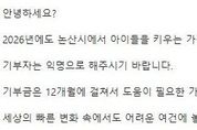 정안뉴스 황도연 기자 | 논산의 새해를 매년 감동으로 물들인‘익명의 기부천사’가 올해도 어김없이 찾아왔다. 지난 2020년부터 6년째 논산시에 기부를 이어온‘익명의 기부천사’는 올해도 2억 7,300만원을 기탁했으며, 총 누적기부액은 14억 9,465만원에 달한다. 기부자는 이번 기탁금을 전달하며 “세상의 빠른 변화 속에서도 어려운 여건에 놓인 아이들이 자신의 가능성을 키워갈 수 있도록 보탬이 되고 싶다”는 진심 어린 마음을 전했다. 특히, ‘우리가 있기에 내가 있다’는 뜻의 아프리카어 ‘우분투(Ubuntu)’정신을 언급하며, 개인의 행복이 공동체의 행복으로 연결된다는 공생의 가치를 강조했다. 올해는 기부자의 뜻에 따라 지원 대상과 체계가 한층 확대됐다. 기존 18세 미만 자녀를 둔 차상위계층뿐 아니라, 교육급여 수급 가구까지 포함해 총 156가구가 혜택을 받는다. 지원기간도 기존 5개월에서 12개월로 늘어나, 취약계층 아동 가구가 1년 내내 조금 더 안정된 생활을 누릴 수 있게 됐다. 백성현 논산시장은 “매년 이어지는 고액 기부에 다시 한번 감사드린다”며 “기