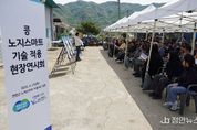 정안뉴스 안정주 기자 | 경기도농업기술원은 23일 연천군 연천읍 옥산리 일원에서 ‘콩 노지스마트 기술 적용 현장 연시회’를 열고, 최근 주목받고 있는 노지 스마트농업 기술을 선보였다. 연천군은 2023년 농촌진흥청이 주관한 노지 스마트농업 시범지구 사업에서 콩 스트레스 관리모델 대상지로 선정됐다. 연시회는 2024년 4월부터 2026년 4월까지 2년간 현장에 적용해 온 콩 재배 관련 기술의 활용 가능성을 공유하기 위해 마련됐다. 이날 현장에서는 국립식량과학원이 개발한 물관리 기술인 무굴착 땅속배수 기술과 관․배수 통합 물관리 기술, AI 기반 해충 무인예찰트랩뿐 아니라 국립농업과학원에서 개발한 무재료 암거형성 배수기술 등 안정적인 콩 생산에 도움이 되는 스마트 기술이 소개됐다. 또한 ㈜대동, ㈜긴트와 협력해 자율주행 키트, 자율주행 트랙터, 드론 자동 방제 등 최근 주목받는 기술 시연이 진행됐다. 이후 경기도가 육성한 콩 신품종과 두부, 콩즙 등 가공품을 전시와 시식 평가가 운영됐다. 이준배 경기도농업기술원 기술보급과장은 “콩 재배 과정에서 자율주행과 드론 기술을 활용한 작업 자동화 가능성을 확인했