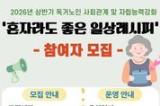 정안뉴스 김재홍 기자 | 고성군이 운영하는 고성군종합사회복지관은 오는 3월 16일부터 관내 65세이상 독거노인을 대상으로 2026년 상반기 독거노인 사회관계 및 자립능력강화 프로그램'혼자라도 좋은 일상레시피' 참여자 20명을 모집한다. 이번 프로그램은 2026년 지방소멸대응기금을 활용해 추진된 사업으로 지역적 특성을 반영해 기획됐으며, 혼자 생활하는 어르신들의 정서적 안정과 사회관계 형성을 지원하고, 일상생활에 필요한 다양한 활동을 통해 자립능력 향상을 돕기 위해 마련됐다. 프로그램은 2026년 4월 1일부터 6월 10일까지 매주 수요일 오전 10시부터 12시까지 총 10회기로 운영되며, 내용은 정서안정 활동을 비롯해 △요리교실 △손바느질 △영양 및 위생 △악기 배우기 등 참여형 체험 프로그램으로 구성되어 어르신들이 서로 소통하고 교류하며 즐겁게 참여할 수 있도록 운영될 예정이다. 모집기간은 2026년 3월 16일부터 3월 27일까지 선착순 모집이며, 고성군 관내 65세 이상 독거노인 20명을 대상으로 한다. 참여를 희망하는 군민은 고성군종합사회복지관 분관(송학로 47-3)에 방문하거나 전화를 통해