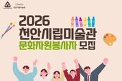 정안뉴스 황도연 기자 | (재)천안문화재단은 오는 19~ 30일 천안시립미술관 문화자원봉사자를 모집한다고 14일 밝혔다. 문화자원봉사자로 선발되면 오는 3월부터 내년 2월까지 관람 안내, 전시·교육·행사 지원 등의 활동을 하게 되며, 봉사실적 인정, 기초·전문 교육, 소정의 활동비 지급 등의 혜택이 제공된다. 모집 대상은 문화예술에 관심이 있는 20세 이상 성인으로, 1차 서류 심사와 2차 인터뷰 심사 등을 통해 내달 30명 내외를 선발할 예정이다. 지원 신청은 천안시립미술관 누리집에 게재된 공고문을 확인한 후 신청서 양식을 내려받아 담당자 이메일로 접수하면 된다. 자세한 사항은 천안시립미술관 누리집을 참고하거나 시각예술팀으로 문의하면 된다.
