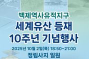 정안뉴스 황도연 기자 | 부여군은 오는 10월 2일 정림사지 일원에서 ‘백제역사유적지구 세계유산 등재 10주년 기념행사’를 개최한다고 밝혔다. 2015년 독일 본에서 열린 제39차 세계유산위원회에서 백제역사유적지구가 한국의 12번째 유네스코 세계유산으로 등재되며 찬란했던 백제 문화를 전 세계에 알리는 역사적인 발걸음을 내디뎠다. 군은 그 뜻깊은 순간을 지역 주민을 비롯한 많은 이들과 함께 기념하고, 10년간 걸어온 발자취를 돌아보며 앞으로의 10년, 100년을 향한 새로운 도약의 뜻을 다지고자 이번 행사를 준비했다. 먼저 식전 행사로는 세계유산의 빛나는 가치를 국악으로 표현한 부여군충남국악단의 ‘세계유산의 빛, 백제의 소리’ 공연과 관내 어린이를 대상으로 사전에 개최된 부여군 어린이 세계유산 그리기 대회의 시상식이 진행된다. 공식 행사로는 세계유산 등재 10주년 축하 퍼포먼스와 정림사지 오층 석탑의 아름다움을 한껏 느낄 수 있는 미디어아트 공연이 펼쳐지고, 이후 인기가수인 10CM와 국카스텐의 축하공연이 이어져 가을밤을 뜨겁게 달굴 예정이다. 또한, 세계유산 등재 10주년 축하 메시지를