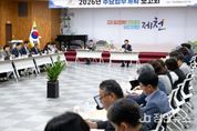 정안뉴스 황은경 기자 | 제천시는 지난 13일 시청 청풍호실에서 김창규 시장 주재로 국장 및 직속기관장, 부서장이 참석한 가운데 2026년 주요업무계획 보고회를 개최했다. 이번 보고회는 민선8기 후반기 시점에 시가 역점적으로 추진해왔던 사업 성과를 돌아보고, 시정을 이끌어갈 부서별 주요업무계획 보고를 주요 내용으로 진행됐다, 내년도 시정방향은 단기적으로 지금까지 구축해 온 성장 발판을 통해 시정 분야별 연계효과를 더욱더 확산시키고, 공약사업 및 핵심사업의 차질 없는 마무리, 시민이 체감하는 변화 완성, 혁신적 정책 발굴 등에 집중해 나가고, 장기적으로 그동안 시가 추진해 온 투자유치, 권역별 관광개발을 두축으로 투자유치 4조원 달성, 1,500만 문화․관광시대를 목표로 두 배 잘사는 경제 도시 제천 실현 기반을 착실히 완수해 나간다는 것이다. 김창규 제천시장은 “민선8기 4년차로 역동적이고 새로운 경제도시 제천을 만들기 위해 쉼 없이 달려왔다면서, 시간이 지나면서 시정이 결실을 맺고 눈에 뛰는 변화를 이뤄낸 것은 시민분들과 전 공직자가 한마음으로 노력한 결과”라며“2026년에도 제천의 미래 성장 동