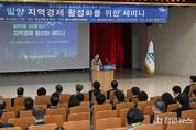 정안뉴스 김재홍 기자 | 경남 밀양시는 지난 28일 경남교육청 진로교육원 강당에서 전국밀양향우연합회 주최로 ‘지역경제 활성화 세미나’가 열렸다고 밝혔다. 이번 세미나는 안병구 밀양시장, 허홍 밀양시의회 의장, 현영희 전국밀양향우연합회 회장을 비롯해 향우 기업인, 주보원 밀양상공회의소 회장, 신영철 밀양시소상공인연합회 회장 등 밀양 경제인 200여 명이 참석한 가운데 성황리에 개최됐다. 이날 행사는 △기조강연 △향우 기업인 성공사례 발표 △밀양시 경제정책 설명 △스탠딩 네트워킹 순으로 진행됐다. 기조강연에서는 이경전 경희대학교 빅데이터응용학과 교수가 ‘AI 시대의 기업 대응 및 경영전략’을 주제로, 급변하는 산업 환경 속에서 기업이 나아가야 할 방향을 제시했다. 이어 향우 기업인 성공사례 발표에서는 장상환 기산전자(주) 대표이사가 기업 성장 과정과 경영 노하우를 공유하며 참석자들의 큰 호응을 얻었다. 또한 밀양시의 주요 경제 현안과 투자유치 전략에 대한 설명과 함께 향우 기업인과 밀양 경제인 간 네트워킹을 통해 실질적인 협력 방안을 모색하는 시간을 가졌다. 현영희 전국밀양향우