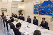 정안뉴스 안정주 기자 | 이재명 대통령이 4일 10대 그룹 총수들을 만나 "성장의 과실이 기성세대뿐만 아니라 우리 사회에 새롭게 진입하는 청년 세대에게도 골고루 퍼지면 좋겠다"며 "민과 관이 협력해서 청년 취업 기회를 늘리는 일에 조금 더 노력해 주길 부탁드린다"고 당부했다. 이 대통령은 이날 오후 청와대에서 열린 '청년 일자리와 지방투자 확대를 위한 기업간담회'를 갖고 이 같이 말했다. 이날 간담회에는 류진 한경협 회장과 함께 삼성 이재용 회장, SK 최창원 부회장, 현대차 정의선 회장, LG 구광모 회장, 롯데 신동빈 회장, 포스코 장인화 회장, 한화 김동관 부회장, HD 현대 정기선 회장, GS 허태수 회장, 한진 조원태 회장 등 10명의 기업인이 참석했다. 이 대통령은 "대한민국 경제가 많은 어려움을 겪는 가운데 수출이 사상 최고치를 경신하고 주가도 5000포인트를 넘어서 국민들이 조금씩 희망을 갖게 됐다. 다 여러분들 덕분"이라며 감사를 표했다. 그러면서 "경제는 생태계와 같아서 성장의 과실과 기회가 대기업뿐 아니라 중소기업, 수도권뿐 아니라 지방, 기성세대뿐 아니라 청년세대에게도 골고루 퍼져야 한다